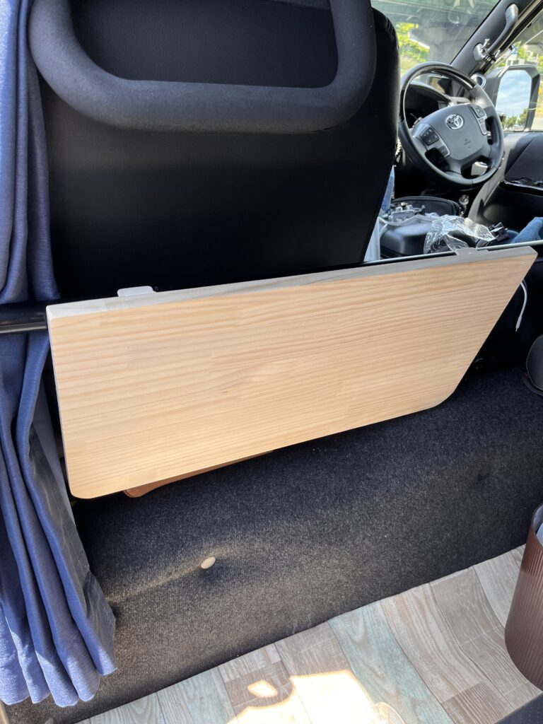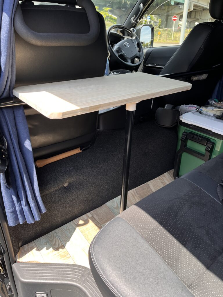ハイエースの車内をもっと便利にしたいなら、跳ね上げ式のセカンドテーブルは本当におすすめです。